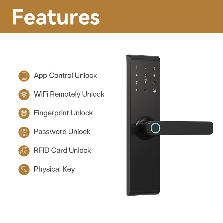 The TENON T11 smart lock integrates cutting-edge technology with user-centric design, delivering unparalleled convenience and peace of mind for you and your family. Understanding your priority for home safety, the T11 features five innovative unlocking methods—Blazing-Fast Fingerprint Recognition, Anti-Peep Passcode, Encrypted RFID Card, Convenient Mobile App, and Traditional Key—catering to the diverse needs of all family members.